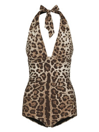 leopard-print swimsuit This Dolce & Gabbana swimsuit stands out with its striking hues and unrivaled comfort. Its stretch design features a deep V-neck and is adorned with a bold leopard print throughout. Highlights - Brown/light beige - Stretch-design - All-over leopard print - V-neck - Halterneck tie fastening - Be mindful to try on swimwear over your own garments. Made in Italy Composition Outer: Nylon 72%, Elastane 28% Lining: Nylon 77%, Elastane 23% Washing instructions Read Manufacturer Guidelines