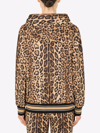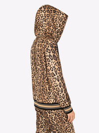 leopard-print zip-up hoodie Dolce & Gabbana embraces bold print, as showcased by this zipped hoodie. Decorated in an all-over leopard print, this long-sleeve design features a gold-tone logo plaque at the chest. Highlights - Brown - All-over leopard print - Stripe trim - Gold-tone logo plaque - Drawstring hood - Front zip fastening - Long sleeves - Two side pouch pockets Made in Italy Composition Outer: Polyester 58%, Cotton 42% Lining: Polyester 58%, Cotton 42%