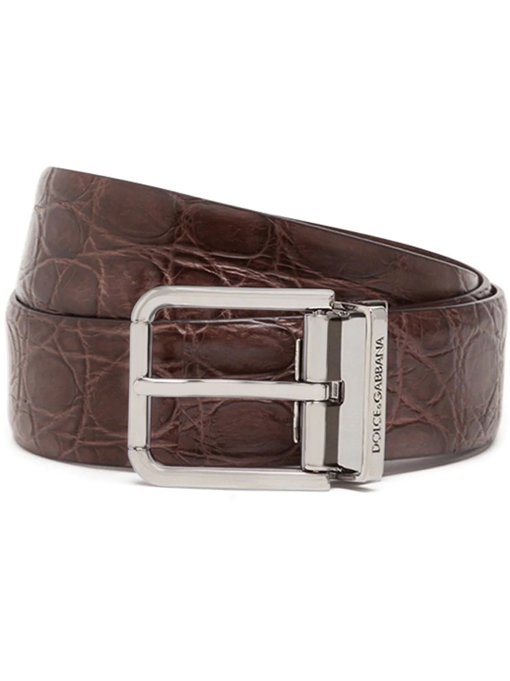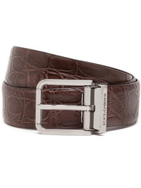 buckled leather belt Sometimes it's the finishing touches that make or break an outfit. With this Dolce & Gabbana logo-buckle belt in your arsenal, you've got the answer to sleek ensembles. Buckle up. Highlights - Coffee brown - Crocodile leather - Engraved logo - Silver-tone buckle fastening - Adjustable fit - This item comes from our partner boutiques in a variety of countries and cannot be shipped outside its region (either us, uae, or the eu & uk). please check the country of origin in the shipping & free returns tab or your shopping bag to make sure it can be delivered to your location. Made in Italy Composition Crocodile Leather 100%