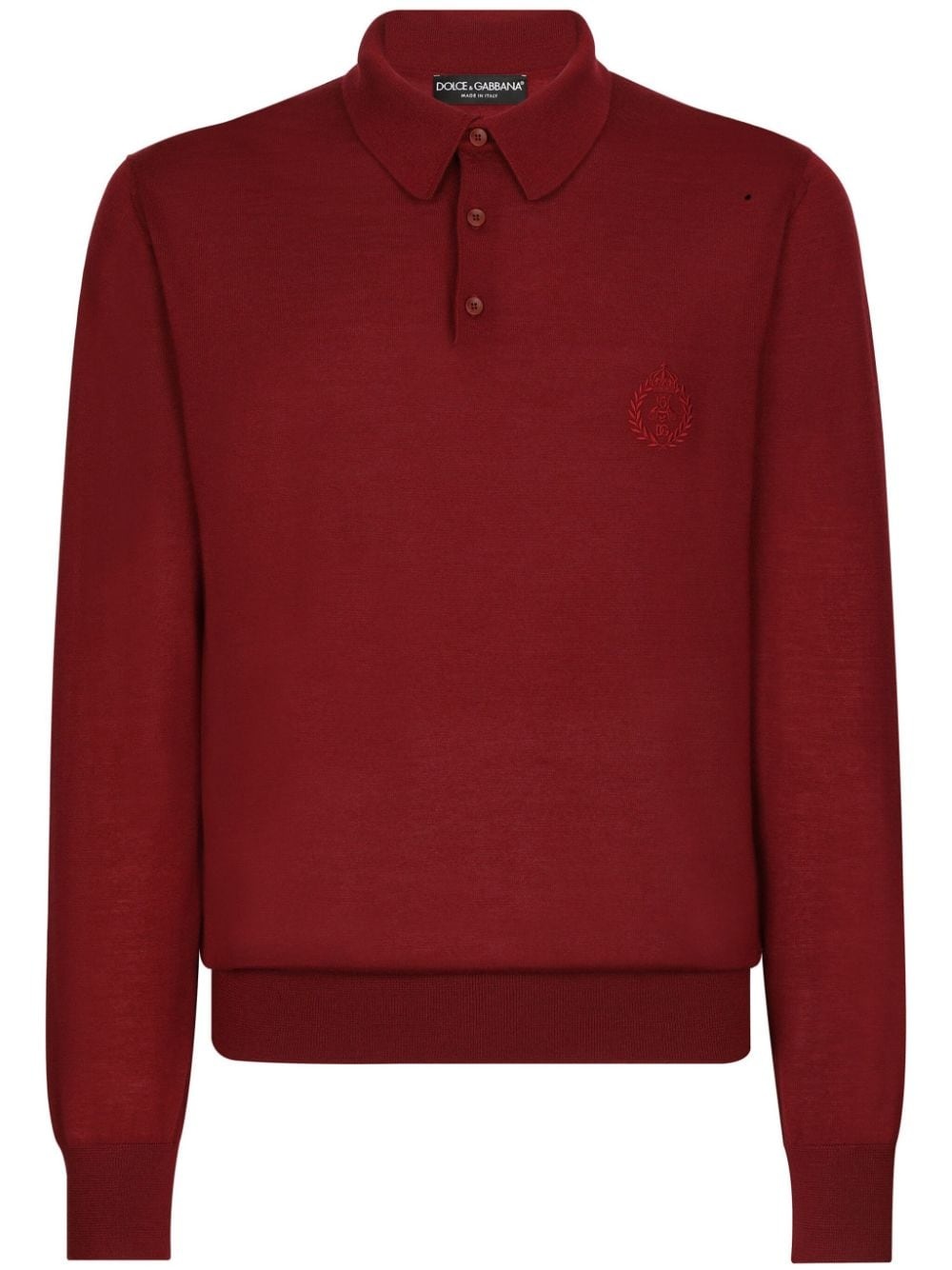 logo-embroidered cashmere polo shirt Crafted from cashmere, Dolce & Gabbana's long-sleeve polo shirt is embroidered with logo detailing on the chest. Highlights - Burgundy - Cashmere - Embroidered logo at the chest - Polo collar - Front button placket - Long sleeves Made in Italy Composition Cashmere 100%
