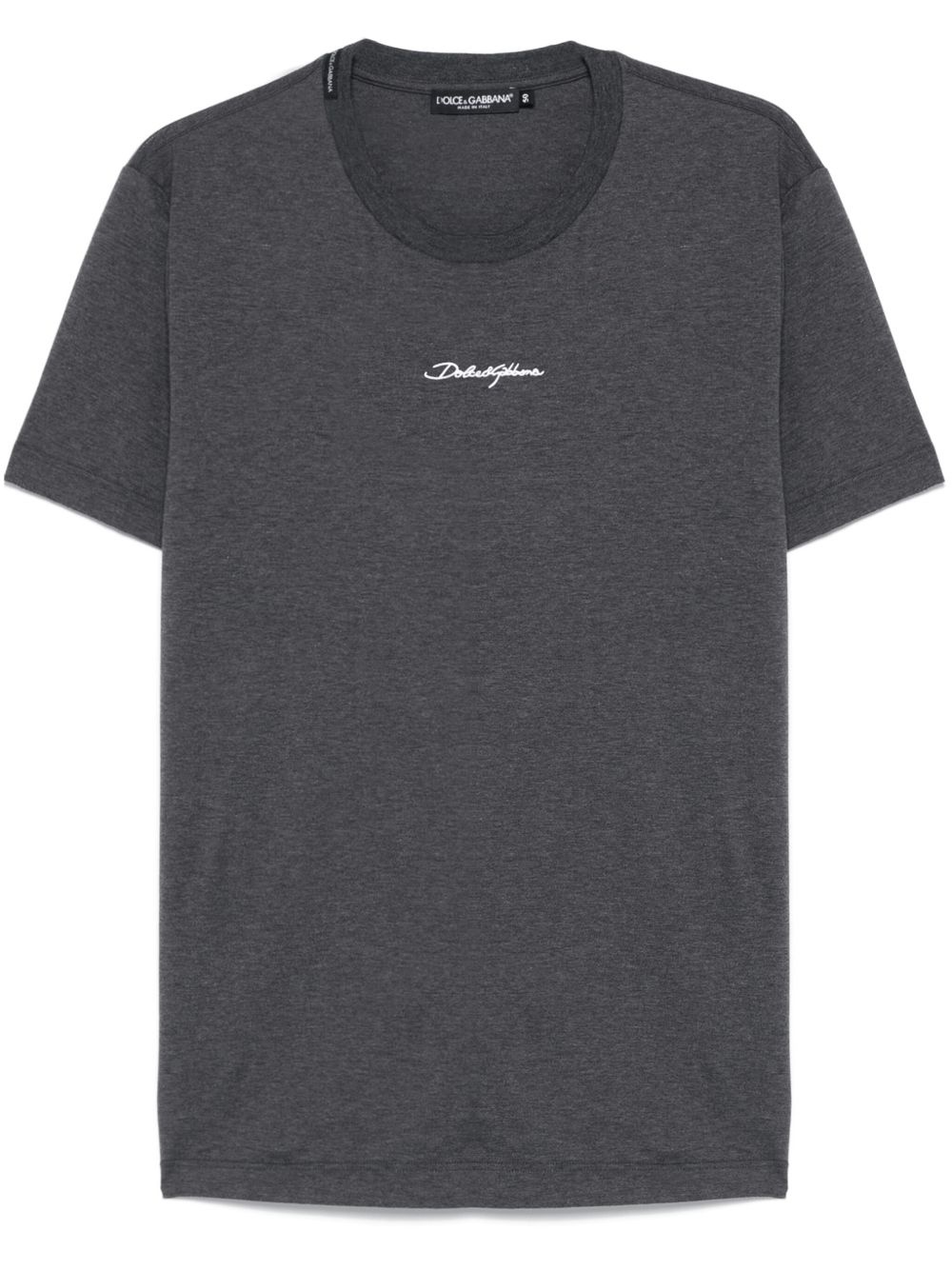 logo-embroidered cotton T-shirt Highlights - Charcoal grey - Crew neck - Short sleeves Made in Italy Composition Cotton 100%, Viscose 100% SIZE & FIT Model measurements Height 6 ft 0 in(1.84 m) Bust/Chest 35.82 in(91 cm) Hips 37 in(94 cm) Waist 28.34 in(72 cm) FittingInformation Designed for a slim fit, offering a comfortable fit that sits just away from the body Made from a midweight non-stretch fabric, this piece offers minimal elasticity when worn