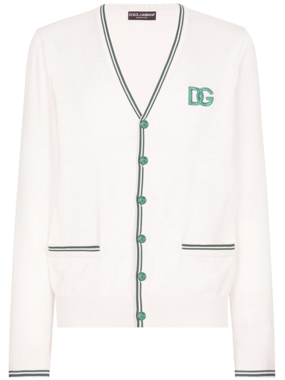 logo-embroidered silk cardigan Highlights - White/green - Silk - Knitted construction - Contrasting trim - Embroidered logo at the chest - V-neck - Front button fastening - Long sleeves - Two front welt pockets - Straight hem Made in Italy Composition Silk 100%