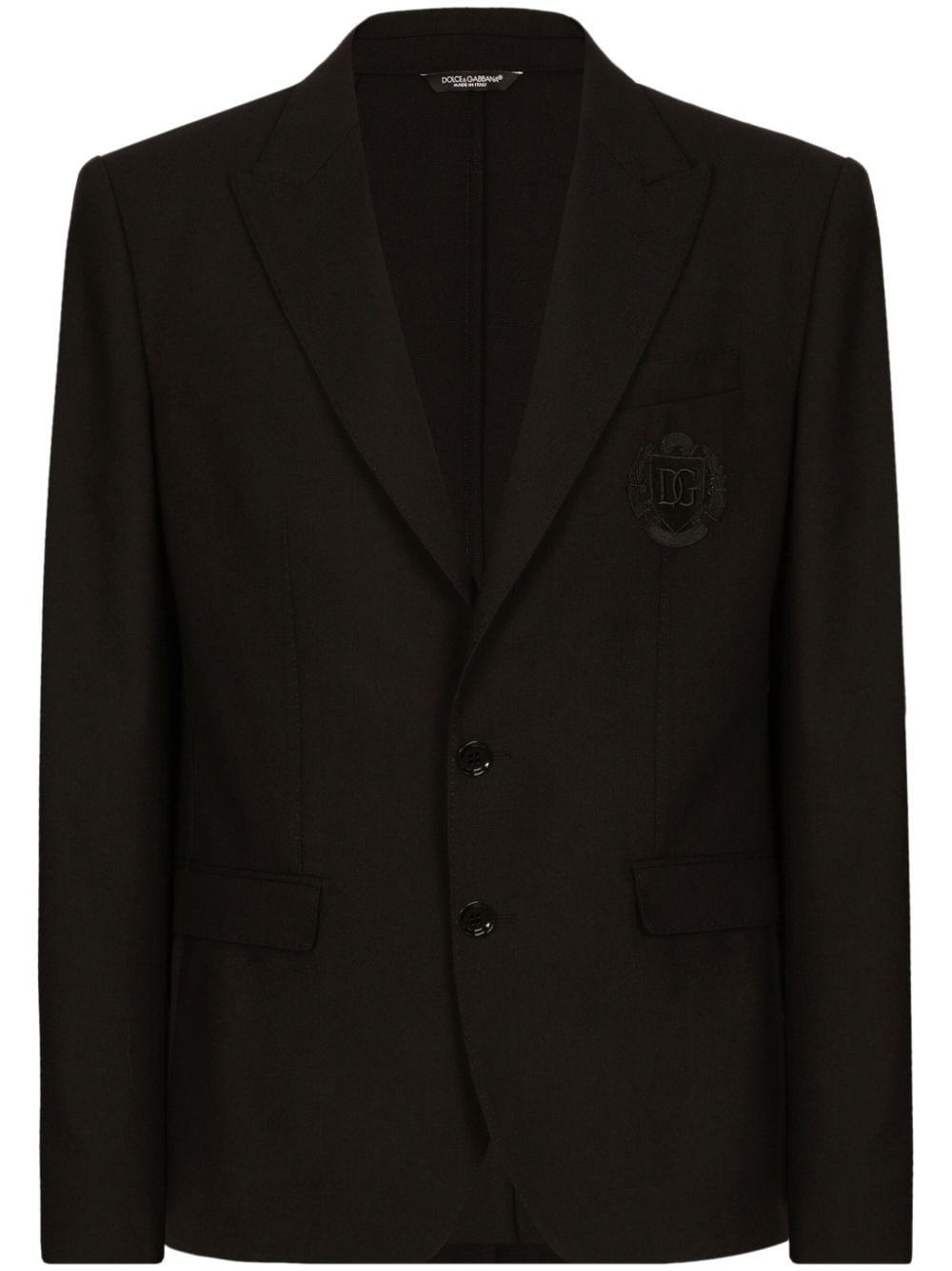 logo-embroidered single-breasted jacket Highlights - Black - Cotton/wool - Embroidered logo at the chest - Peak lapels - Front button fastening - Long sleeves Made in Italy Composition Lining: Cotton 100% Outer: Wool 100%