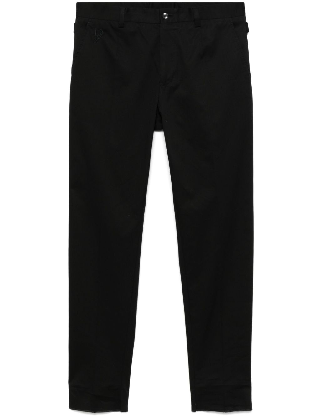 logo-embroidered trousers Highlights - Black - Front button and zip fastening - Belt loops - Two side slash pockets - Two rear button-fastening jetted pockets Made in Italy Composition Polyester 100%, Cotton 97%, Elastane 3% SIZE & FIT Model measurements Height 6 ft 0 in(1.84 m) Bust/Chest 35.82 in(91 cm) Hips 37 in(94 cm) Waist 28.34 in(72 cm) FittingInformation Designed for a slim tapered leg, offering a close fit that sits just away from the leg with a closer fit towards the ankle The unfinished hems allow for the length to be altered Made from a midweight non-stretch fabric