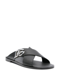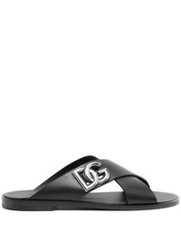 DG-logo leather sandals Expertly crafted from supple calf leather, these sleek slides from Dolce & Gabbana are fitted with interwoven straps at the front and emblazoned with a signature DG plaque. Highlights - Black - Calf leather - Almond open toe - Silver-tone logo lettering - Crossover strap at the toe - Branded leather insole - Rubber sole - Slip-on style Made in Italy Composition Lining: Calf Leather 100% Sole: Calf Leather 100%, Rubber 100% Outer: Calf Leather 100% SIZE & FIT Measurement HEEL 0.59 in(1.5 cm)