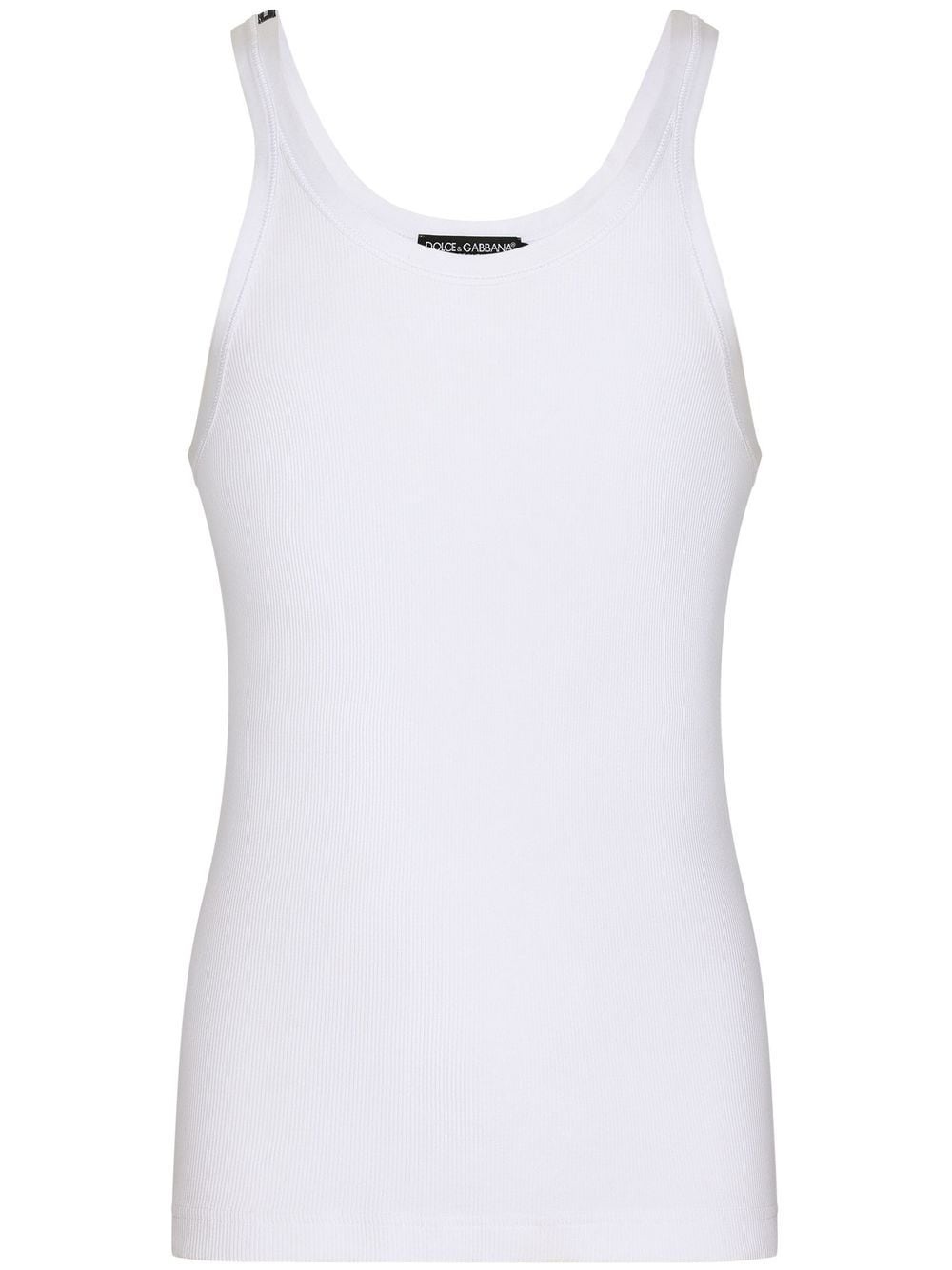 fine-rib tank top Running away from the brand's usual bold prints and colours, this tank top from Dolce & Gabbana arrives in an all white colour. Its design is crafted from stretch cotton and is highlighted with an internal logo patch. Highlights - Cloud white - Cotton - Logo patch detail - Round neck - Sleeveless - Straight hem Made in Italy Composition Cotton 100% SIZE & FIT FittingInformation Designed for a slim fit, offering a comfortable fit that sits just away from the body Made from a midweight non-stretch fabric, this piece offers minimal elasticity when worn This piece fits true to size – take your usual size