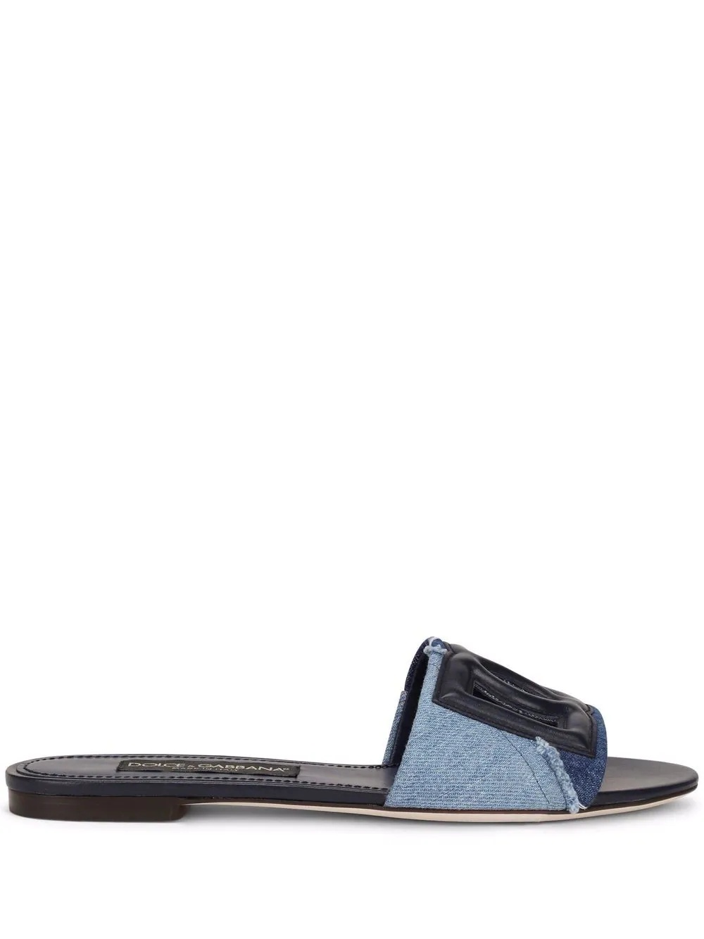 DG-logo patchwork-denim sandals Dolce & Gabbana pairs bold opulence with a contemporary use of branding in this pair of sandals. Featuring a large logo patch at the front of the design, their open-toe, slip-on silhouette adds a relaxed feel to the design. Highlights - Blue - Logo patch to the front - Open toe - Slip-on style - Flat sole Made in Italy Composition Outer: Cotton 75%, Calf Leather 25% Lining: Goat Skin 90%, Calf Leather 10% Sole: Leather 100%