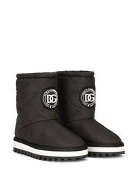 logo-patch padded boots Never subtle when it comes to showcasing their branding, Dolce & Gabbana presents this pair of padded boots for AW21. Featuring black and white logo patches to the front, there's no question where these shoes come from. This bold design reflects the Italian label's maximalist approach to style. Made in Italy Composition Other fibres 100%