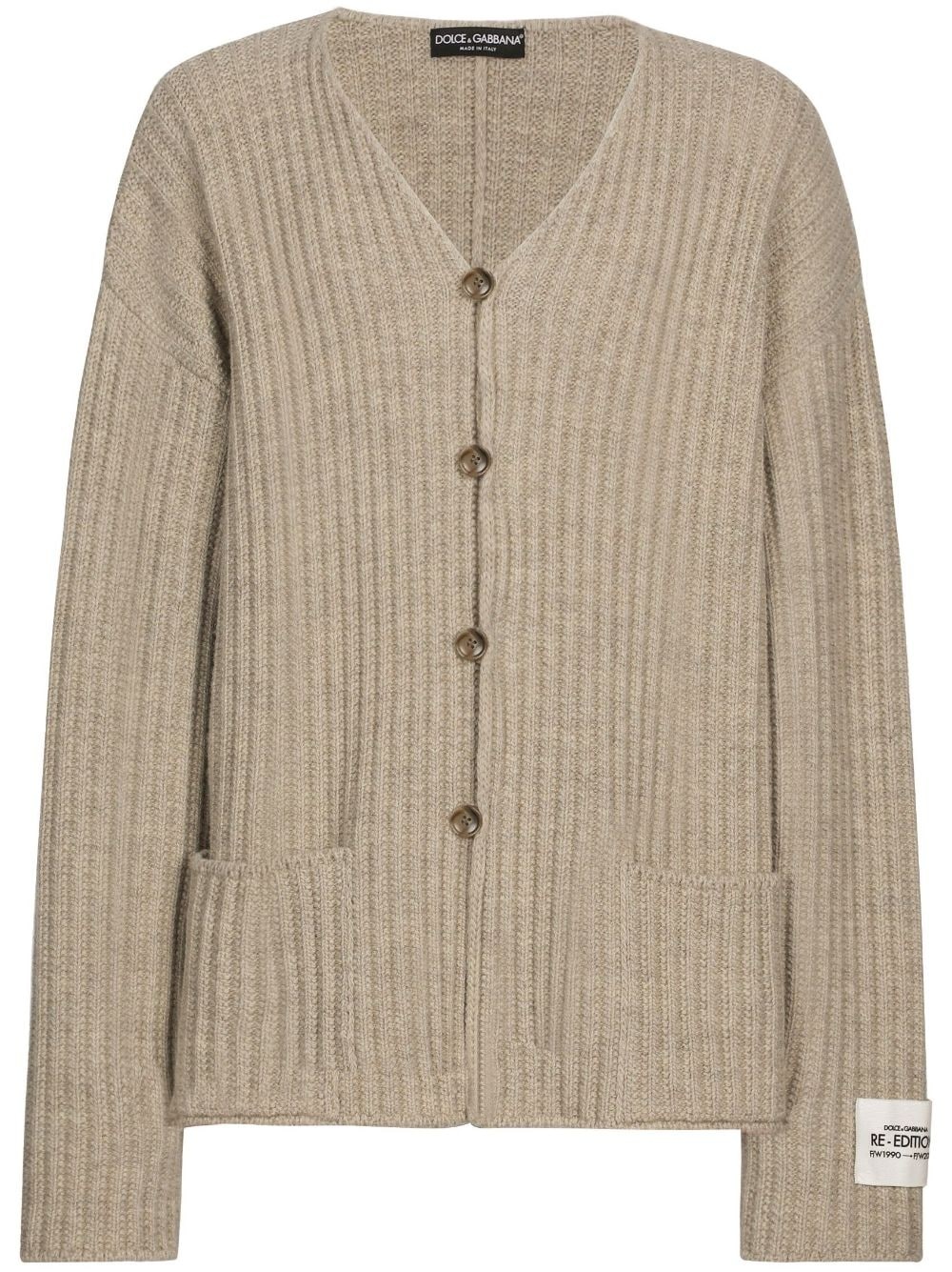 logo-patch V-neck cardigan Highlights - Beige - Wool - Knitted construction - Logo patch at the sleeve - V-neck - Front button fastening - Extra-long sleeves - Two front patch pockets - Straight hem Made in Italy Composition Wool 100%