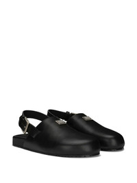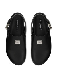 logo-plaque buckled leather sandals Dolce & Gabbana keeps it simple and functional with these closed-toe sandals. Crafted from smooth black leather, they fasten at the ankle with a buckle strap and are minimally detailed with an engraved logo plaque for a subtle branded finish. Highlights - Black - Calf leather/lambskin - Round toe - Silver-tone logo plaque - Silver-tone hardware - Buckle-fastening ankle strap - Branded leather insole - Moulded footbed - Flat rubber sole Made in Italy Composition Sole: Rubber 100% Lining: Calf Leather 100% Outer: Lambskin 100%