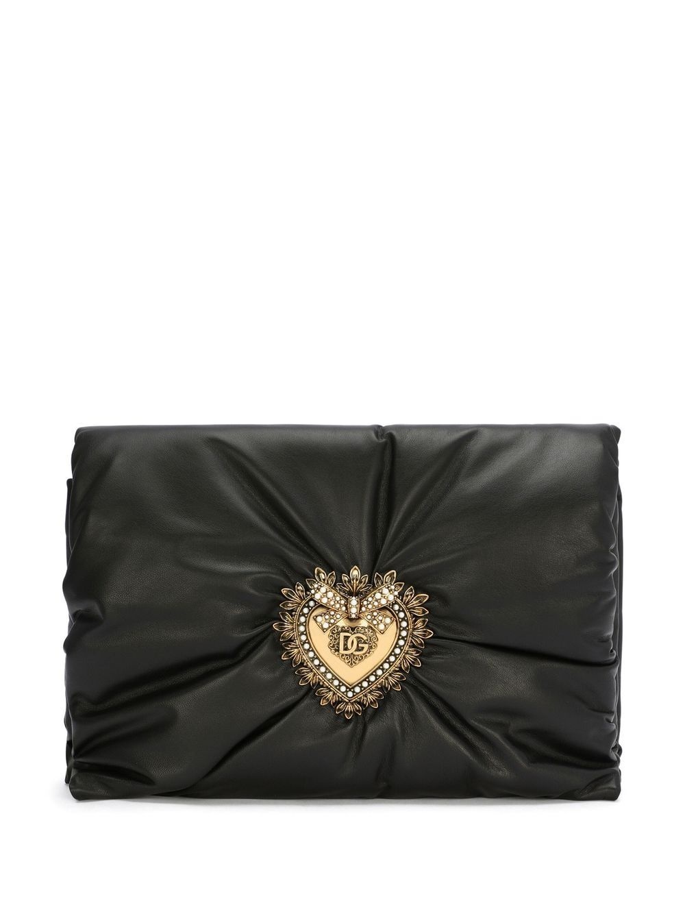 medium Devotion Soft clutch Highlights - Black - Calf leather - Padded design - Signature sacred heart plaque - Gold-tone hardware - Foldover top with magnetic fastening - Detachable leather and chain-link shoulder strap - Main compartment - Internal logo stamp - Internal slip pocket - Leather lining - This piece comes complete with a protective dust bag. Made in Italy Composition Lining: Calf Leather 100% Outer: Calf Leather 100% SIZE & FIT Measurement STRAP 16.53 in(42 cm) DEPTH 0.78 in(2 cm) WIDTH 11.41 in(29 cm) HEIGHT 7.48 in(19 cm)