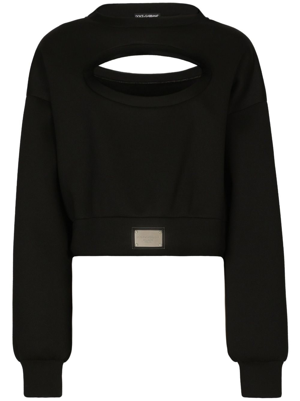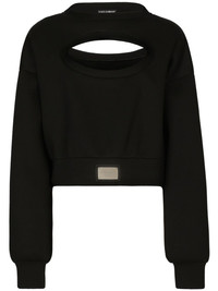 logo-plaque cut-out jumper Dolce & Gabbana updates the humble black jumper with rounded cut-outs at the chest and back, revealing flashes of skin. The silver-tone logo plaque offers a branded touch to the slouchy silhouette. Highlights - Black - Cut-out detailing - Silver-tone logo plaque - Crew neck - Long sleeves - Ribbed cuffs and hem Made in Italy Composition Rayon 100%