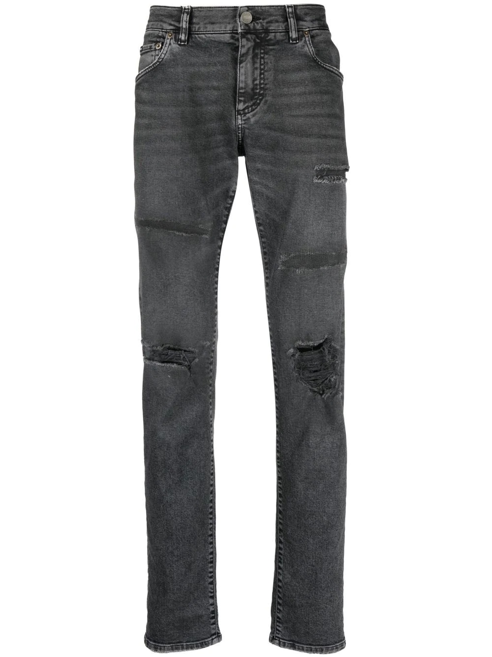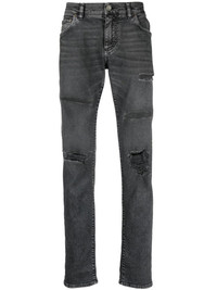 logo-plaque distressed jeans black faded effect distressed finish concealed front zip fastening belt loops classic five pockets mid-rise straight leg Made in Italy Composition Cotton 98%, Spandex/Elastane 2% SIZE & FIT Model measurements Height 6 ft 1 in(1.86 m) Bust/Chest 37.4 in(95 cm) Hips 34.64 in(88 cm) Waist 29.13 in(74 cm) FittingInformation This piece fits true to size. We recommend you get your regular size Cut for a slim fit Made with a mid-weight stretch fabric Washing instructions Machine Wash