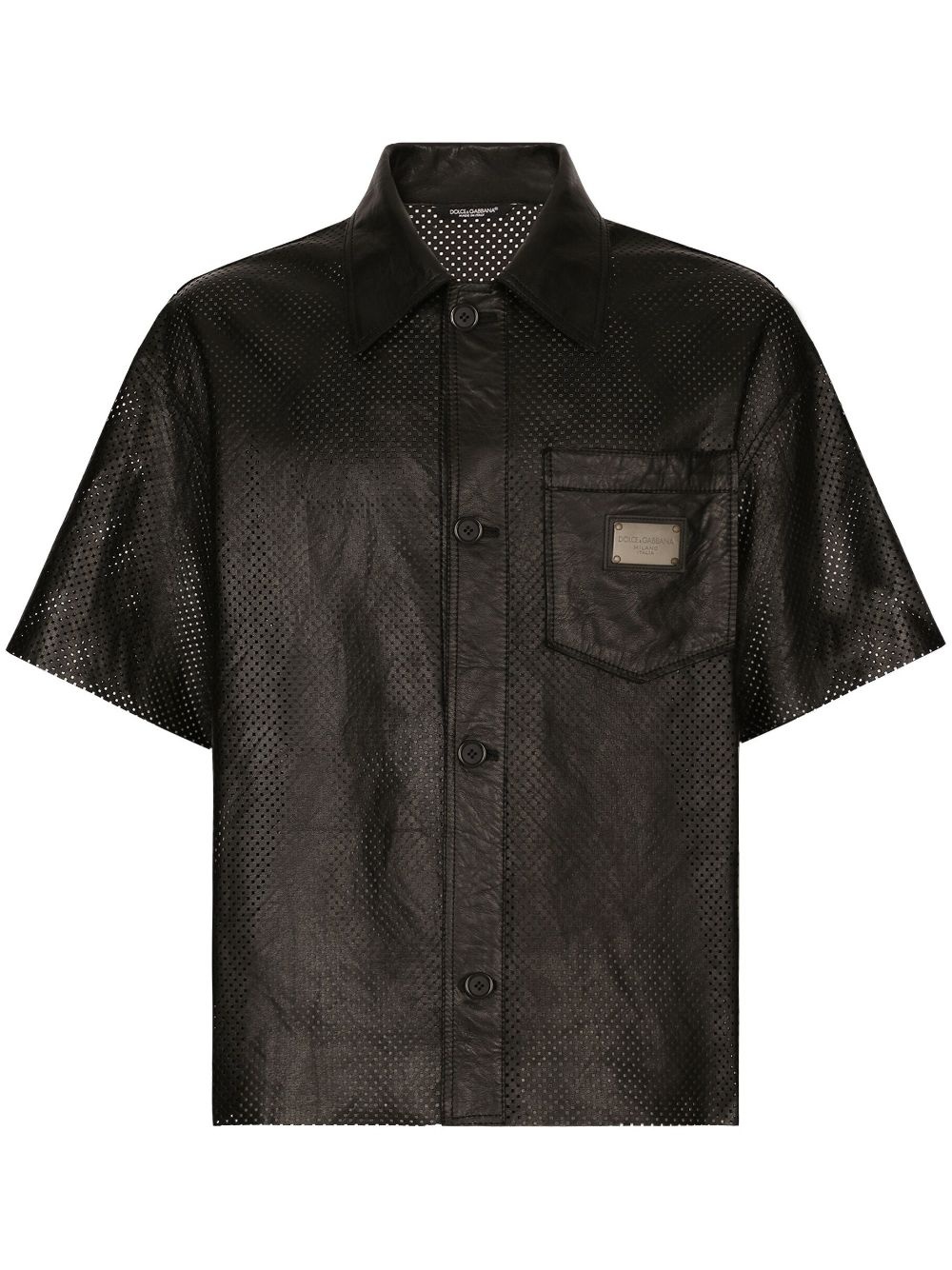 logo-plaque leather shirt Highlights - Black - Lambskin - Logo plaque - Pointed flat collar - Front button fastening - Short sleeves - Chest patch pocket - Straight hem Made in Italy Composition Lambskin 100%
