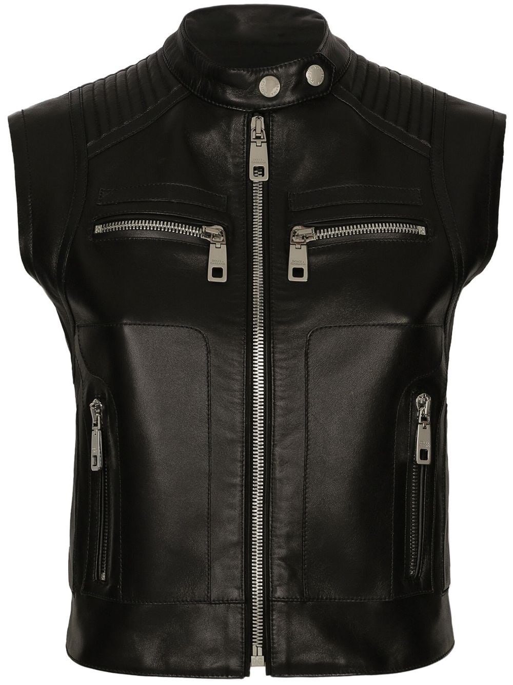logo-plaque leather waistcoat Dolce & Gabbana showcases its rebellious side with this waistcoat. Crafted from leather, it's enhanced with silver-tone hardware and a logo plaque to the back. Highlights - Black - Lambskin - Silver-tone logo plaque - Silver-tone hardware - Round neck - Front zip fastening - Sleeveless - Two zip-fastening chest pockets - Two side zip-fastening pockets Made in Italy Composition Lining: Polyester 62%, Nylon 35%, Elastane 3% Outer: Lambskin 100%