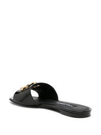 DG-logo leather slides Synonymous with Dolce & Gabbana's extravagant aesthetic, these slides are made from glossy black leather and finished with the DG logo for a recognisable element. Highlights - Black - Calf leather - Patent finish - Gold-tone logo plaque - Round open toe - Slip-on style - Branded footbed - Low stacked heel - Leather outsole - This piece comes complete with a protective dust bag. Made in Italy Composition Sole: Calf Leather 100% Outer: Calf Leather 100% Lining: Calf Leather 100% SIZE & FIT Measurement HEEL 0.59 in(1.5 cm)