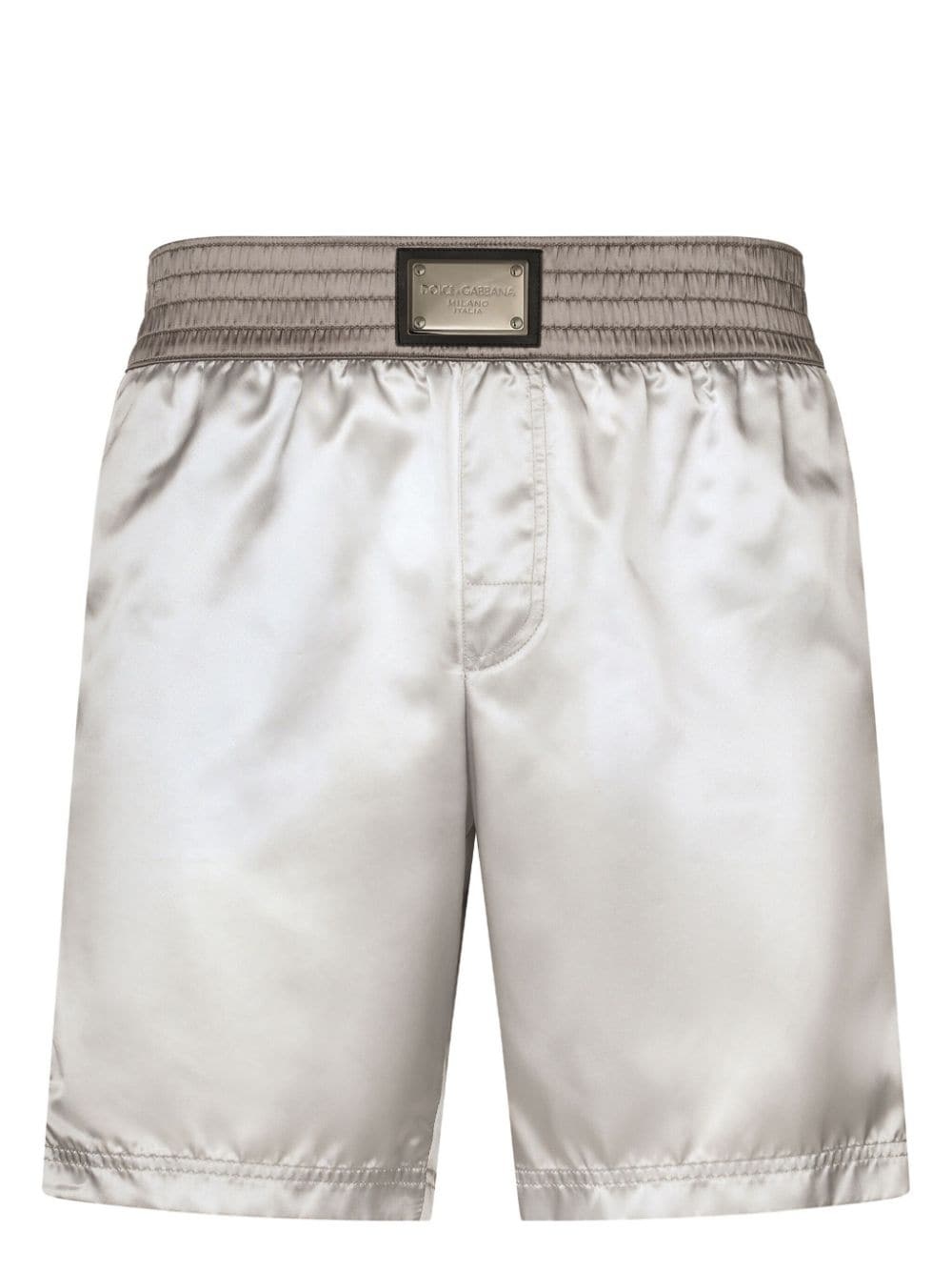 logo-plaque satin swim shorts Highlights - Beluga grey - Cool grey - Stretch-design - Satin finish - Silver-tone logo plaque - Elasticated waistband - Straight leg - Two side inset pockets - Rear zip-fastening pocket - Be mindful to try on swimwear over your own garments. Made in Italy Composition Outer: Polyamide 100% Lining: Polyamide 85%, Spandex/Elastane 15%