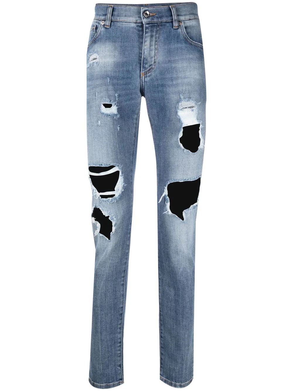 logo-plaque skinny-fit jeans Dolce & Gabbana's Italian-made skinny jeans are detailed with a gold-tone logo engraved plaque that sits on the rear right pocket. Fabricated in stretch-cotton, they feature a distressed finish. Made in Italy Composition Cotton 98%, Elastane 2% SIZE & FIT Model measurements Height 6 ft 3 in(1.9 m) Bust/Chest 38.18 in(97 cm) Hips 37.79 in(96 cm) Waist 32.67 in(83 cm) FittingInformation This piece fits true to size. We recommend you get your regular size Cut for a slim fit Made with a mid-weight stretch fabric Washing instructions Machine Wash