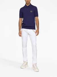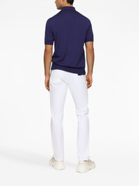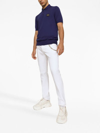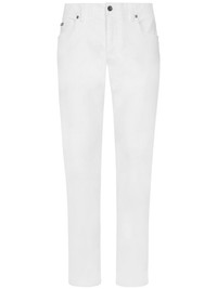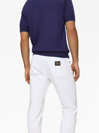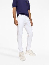 logo-plaque slim-fit jeans Showcasing a classic slim-fit silhouette, these white jeans from Dolce & Gabbana are finished with a silver-tone logo plaque at the rear for a branded touch. Highlights - White - Cotton - Silver-tone logo plaque - Mid-rise - Belt loops - Button fly fastening - Classic five pockets - Slim cut Made in Italy Composition Cotton 100%
