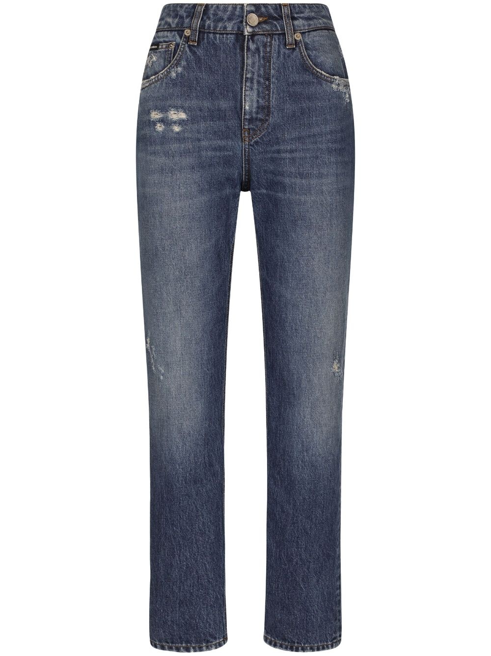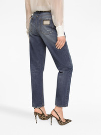 logo-plaque straight-leg jeans Highlights - Blue - Cotton - Denim - Stonewashed - Distressed finish - Logo plaque - High-waisted - Belt loops - Front button and zip fastening - Classic five pockets Made in Italy Composition Cotton 100% Washing instructions Read Manufacturer Guidelines