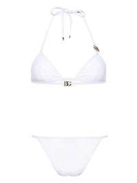 logo-plaque triangle-cup bikini Dolce & Gabbana's signature logo plaque appears on the bikini shoulder strap and doubles as a fastening at the front. Highlights - White - Stretch-design - Soft scuba jersey - Top: - Dart detailing - Gold-tone logo plaque - Halterneck tie fastening - Triangle cup - Logo-buckle fastening to the rear - Bottom: - High cut - Elasticated trim - Be mindful to try on swimwear over your own garments. Made in Italy Composition Lining: Polyamide 80%, Elastane 20% Outer: Brass 100%, Polyamide 72%, Elastane 28% Washing instructions Hand Wash
