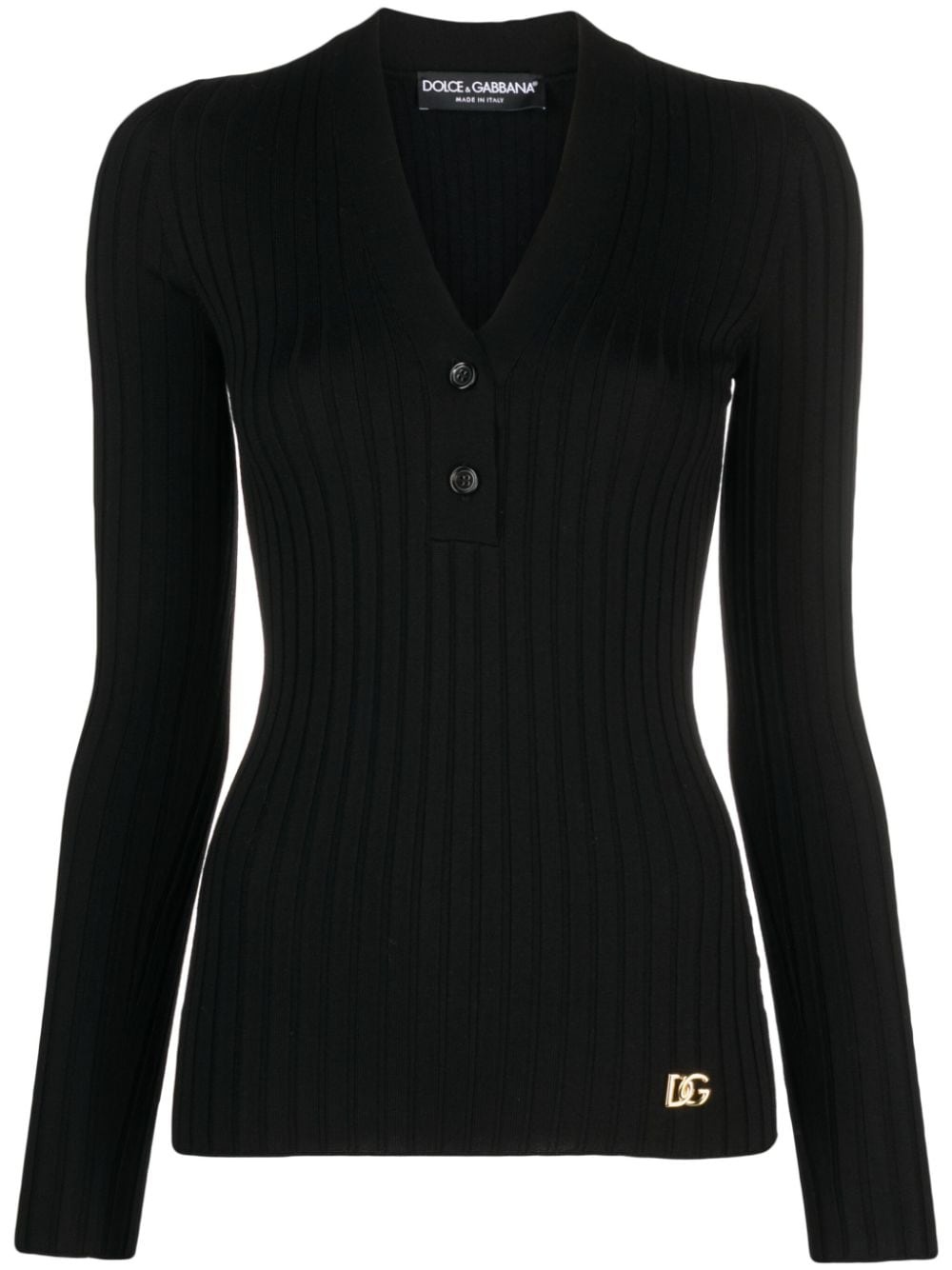 logo-plaque wool-blend top Crafted from a virgin wool blend, Dolce & Gabbana's ribbed knit top is sculpted to a V-neckline and features a gold-tone logo plaque at the hemline. Highlights - Black - Virgin wool blend - Ribbed knit - Gold-tone logo plaque - V-neck - Front button placket - Long sleeves Made in Italy Composition Virgin Wool 99%, Polyamide 1% SIZE & FIT Model measurements Height 5 ft 10 in(1.78 m) Bust/Chest 33.46 in(85 cm) Hips 36.22 in(92 cm) Waist 23.22 in(59 cm) FittingInformation Designed for a close fit throughout Made with a midweight knit, this piece offers some stretch This piece fits true to size – take your usual size