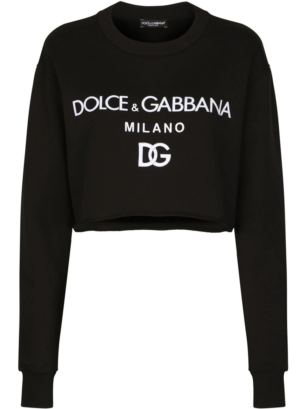 logo-print cropped sweatshirt Dolce & Gabbana enhances a cropped silhouette with their iconic DG logo lettering. As seen to the front of this sweatshirt, the all-black cotton fabrication brings the contrasting branding to focus for a recognisable look. Made in Italy Composition Cotton 100%