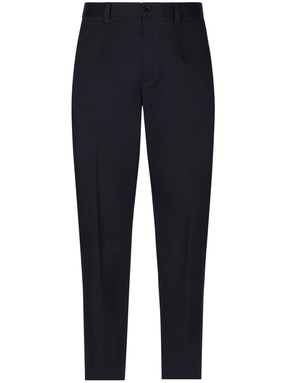 logo-tag cotton-blend tapered trousers Highlights - Navy blue - Stretch-cotton - Logo tag - Belt loops - Front button fastening - Two side slit pockets - Two rear jetted pockets - Tapered leg Made in Italy Composition Cotton 97%, Spandex/Elastane 3% SIZE & FIT Measurement FRONT RISE 10.43 in(26.5 cm) INSIDE LEG 29.52 in(75 cm) HIPS 42.51 in(108 cm) Washing instructions Read Manufacturer Guidelines
