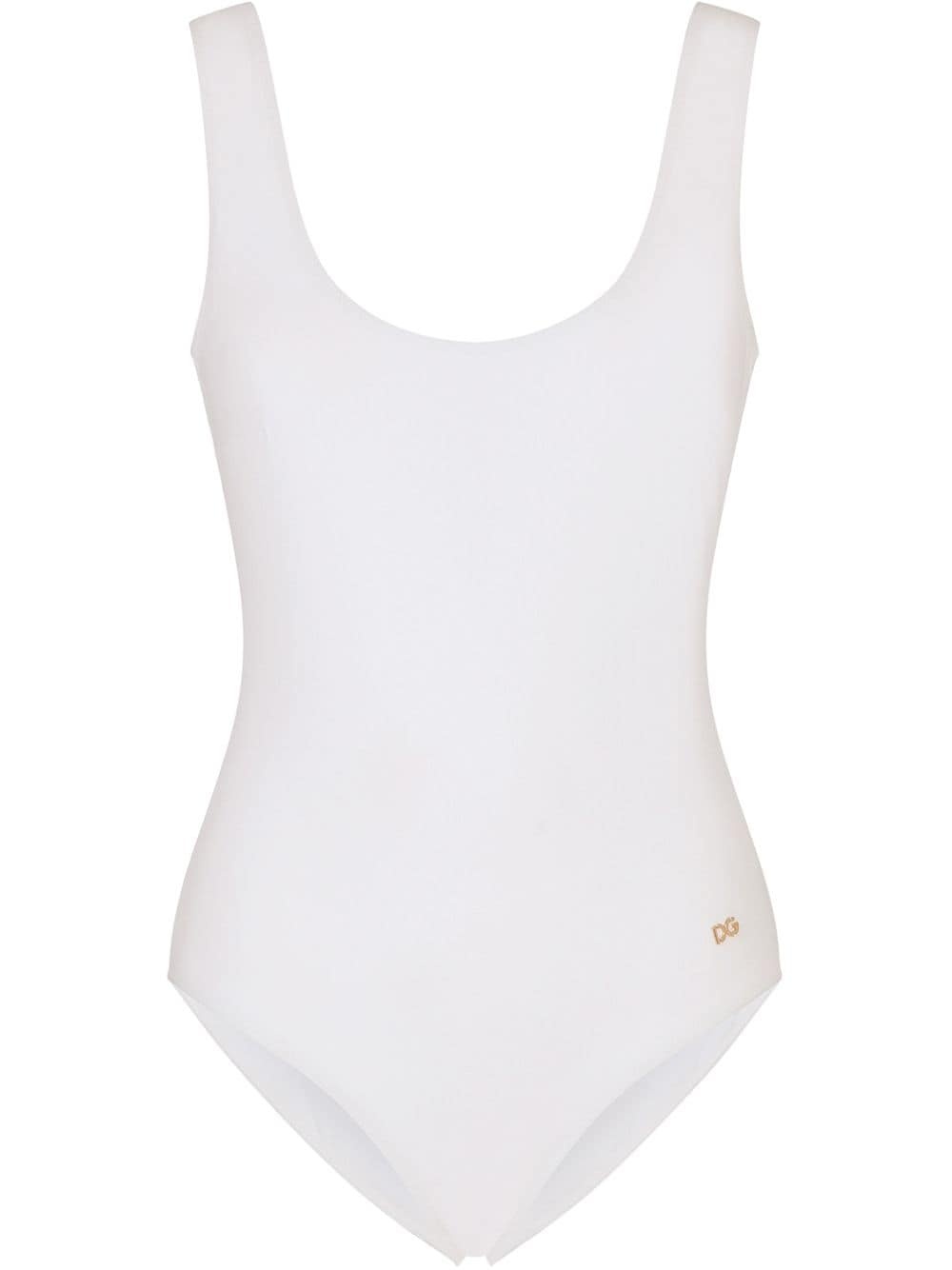 logo-tag scoop-back swimsuit Dreaming of your next date in the sun? With this optical white one-piece swimsuit from Dolce & Gabbana you'll feel one step closer to the sea. Highlights - Optical white - U-neck - Gold-tone logo lettering - Open back - Tonal stitching - Stretch design - Be mindful to try on swimwear over your own garments. Made in Italy Composition Outer: Nylon 75%, Elastane 25% Lining: Polyamide 80%, Spandex/Elastane 20%