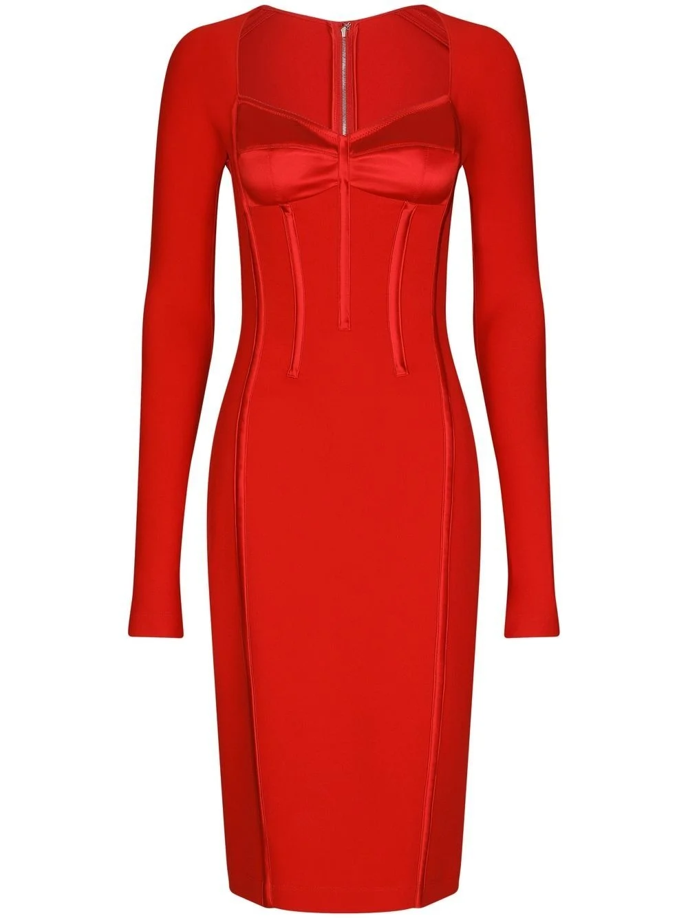 long-sleeve corset dress Highlights - Cardinal red - Silk blend - Stretch-design - Sweetheart neck - Concealed rear zip fastening - Long sleeves - Straight hem - Corset style Made in Italy Composition Outer: Rayon 65%, Silk 19%, Nylon 11%, Spandex/Elastane 5% Lining: Silk 96%, Spandex/Elastane 4% SIZE & FIT Measurement HIPS 34.05 in(86.5 cm) LENGTH 44.09 in(112 cm) WAIST 25.59 in(65 cm)