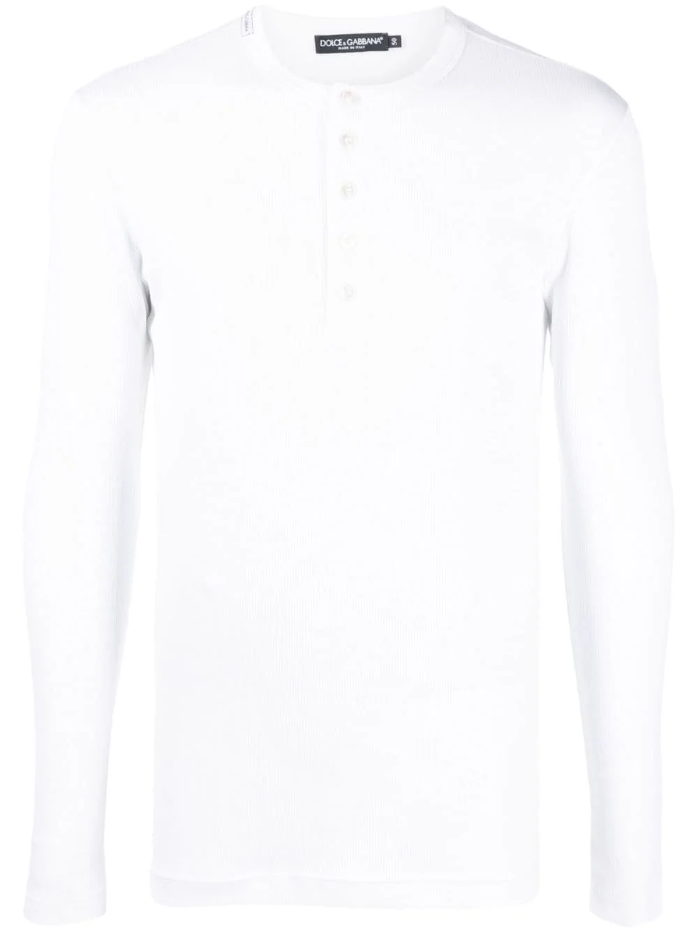 long-sleeve Henley T-shirt Crafted from white cotton, this long-sleeved Henley T-shirt proves Dolce & Gabbana's mastery over basic wardrobe staples, foregoing embellishment for simple, clean lines. Highlights - White - Cotton - Crew neck - Front button placket - Long sleeves Made in Italy Composition Cotton 100% SIZE & FIT Model measurements Height 6 ft 1 in(1.85 m) Bust/Chest 35.82 in(91 cm) Hips 37.79 in(96 cm) Waist 29.13 in(74 cm) FittingInformation Designed for a close fit throughout Made from a lightweight non-stretch fabric, this piece offers minimal elasticity when worn This piece fits true to size – take your usual size