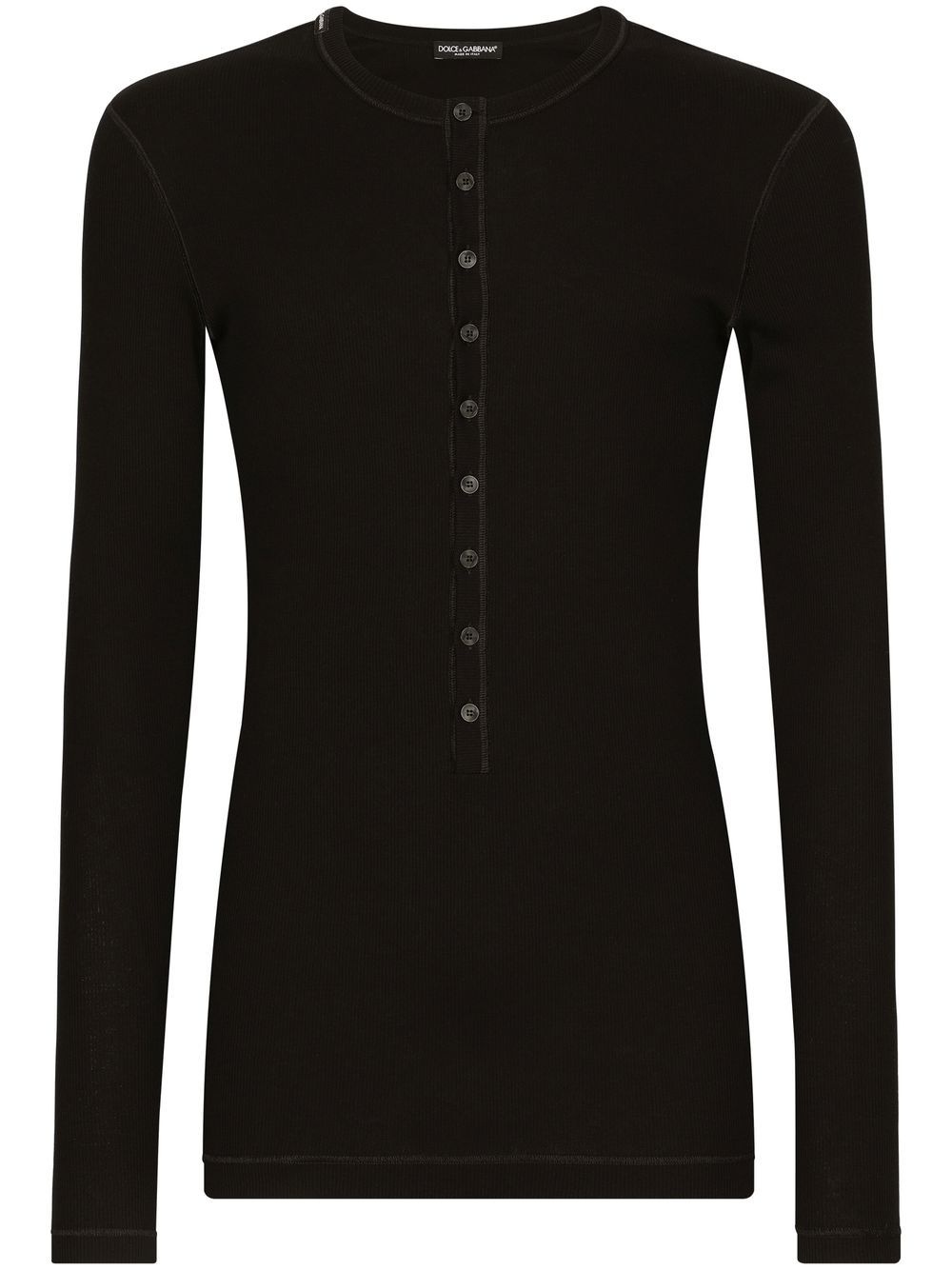 fine-rib cotton T-shirt Crafted from soft cotton, this long-sleeve T-shirt from Dolce & Gabbana is characterised by a front-button fastening. Highlights - Black - Cotton - Crew neck - Short front button fastening - Long sleeves - Straight hem - Slim cut Made in Italy Composition Cotton 100% Washing instructions Machine Wash