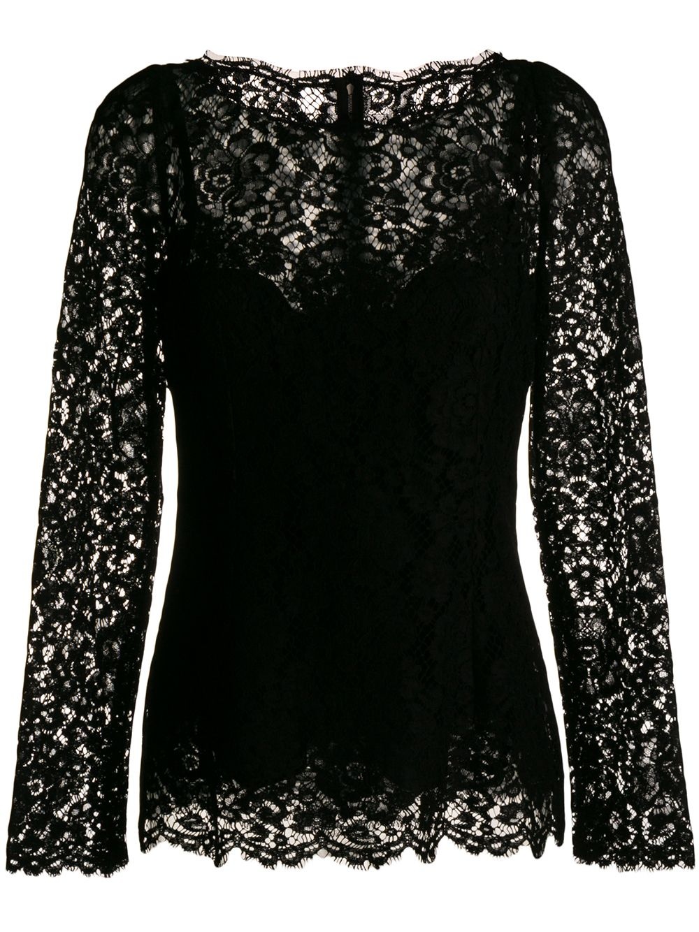 cordonetto-lace long-sleeve T-shirt Highlights - Heritage tulle and lace have become an intrinsic part of dolce & gabbana's exuberantly romantic, feminine collections. refined and elegantly feminine, this black cotton and silk lace blouse from dolce & gabbana presents a boat neck, a rear zip fastening, long sheer sleeves, a slim fit and a scalloped lace hem. Made in Italy Composition Lining: Silk 76%, Cotton 16%, Polyamide 4%, Spandex/Elastane 4% Outer: Cotton 46%, Viscose 43%, Polyamide 11% SIZE & FIT Model measurements Height 5 ft 10 in(1.79 m) Bust/Chest 33.46 in(85 cm) Hips 35.43 in(90 cm) Waist 25.19 in(64 cm) Washing instructions Dry Clean Only