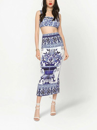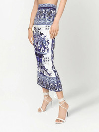 Majolica-print pencil skirt For AW23, Dolce & Gabbana revives their iconic Majolica pattern, inspired by Mediterranean pottery artwork. Crafted in stretch silk, this fitted pencil skirt has the brand's distinctive blue and white design. Highlights - Blue/white - Stretch-silk - Majolica print - High waist - Concealed rear zip fastening - Pencil silhouette - Straight hem Made in Italy Composition Silk 94%, Elastane 6%