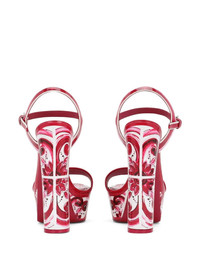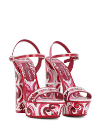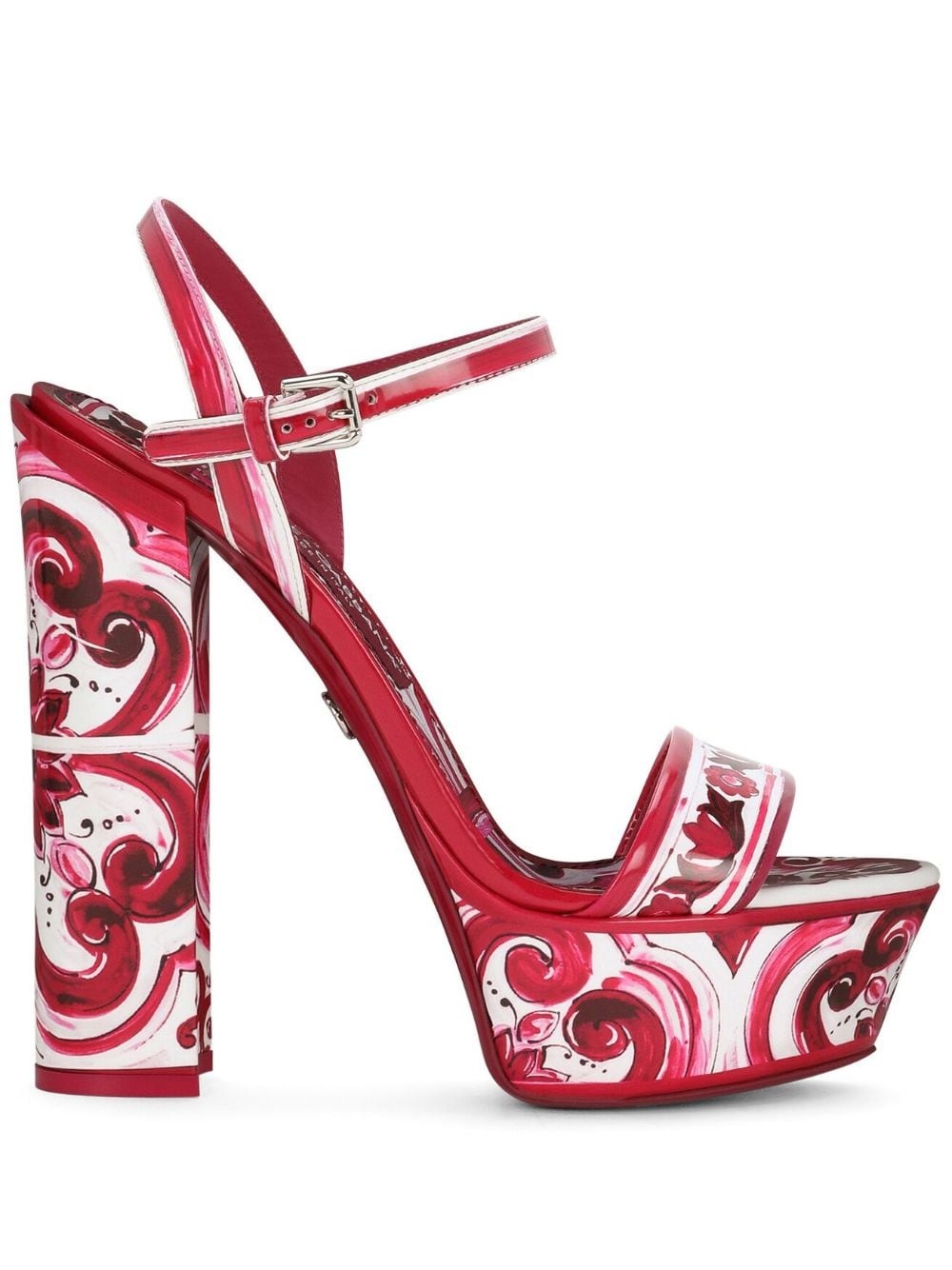 Maiolica-print platform sandals These Dolce & Gabbana platform sandals are defined by the Maiolica print, a signature pattern that features Sicilian pottery designs and intricates floral and geometric motifs. They feature an open toe and secured with a buckled ankle strap for the perfect fit. Highlights - Off-white/dark red/fuchsia pink - Calf leather - Floral print - Open toe - Buckle-fastening ankle strap - Branded insole - Platform sole - High block heel Made in Italy Composition Outer: Calf Leather 100% Lining: Goat Skin 90%, Calf Leather 10% Sole: Calf Leather 100%