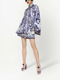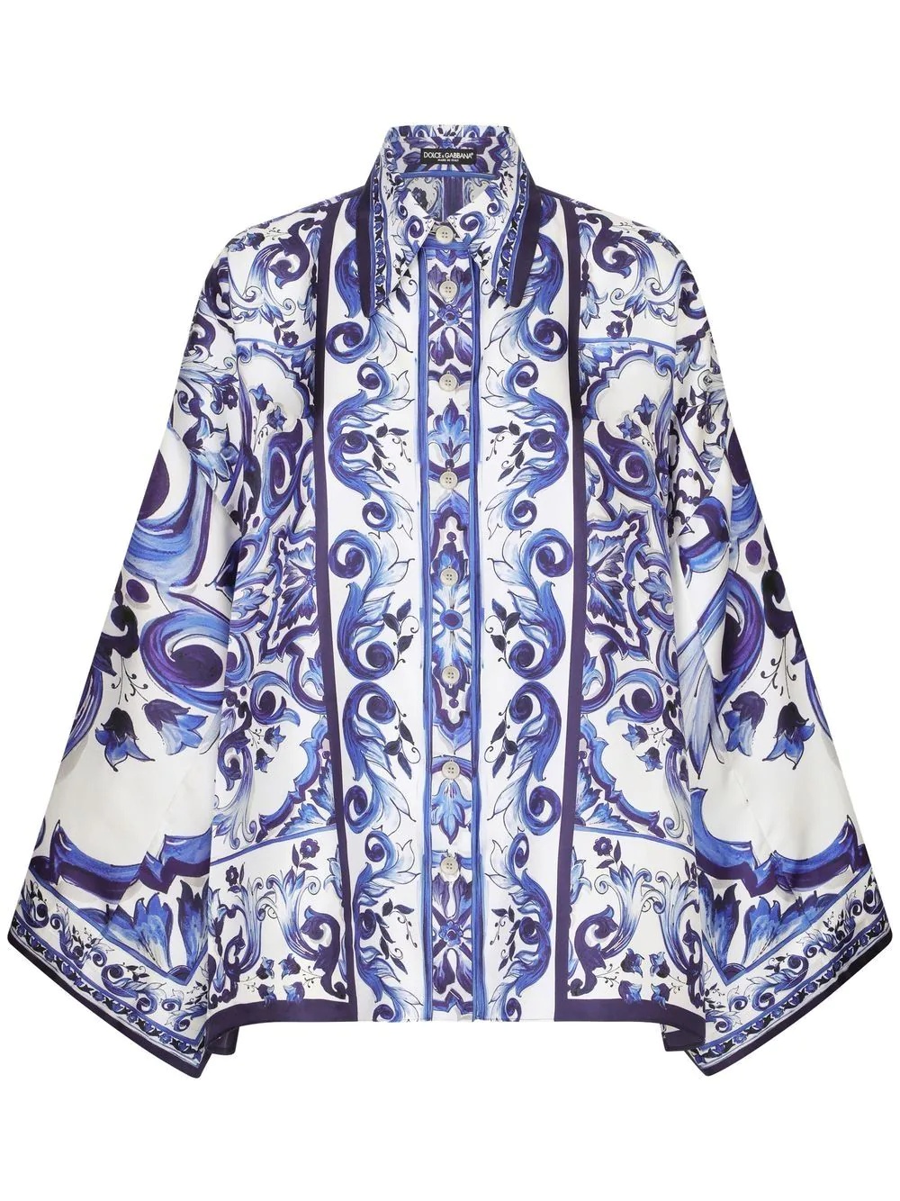 Majolica-print batwing-sleeve shirt Dolce & Gabbana brings back its iconic Majolica print for AW22. Crafted from smooth silk, this wide-sleeve shirt displays the signature motif in white and blue tones. Made in Italy Composition Silk 100% SIZE & FIT Measurement LENGTH 28.34 in(72 cm) FittingInformation Designed to be unstructured, offering a loose fit throughout