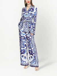 Majolica-print silk pajama shirt Dolce & Gabbana brings back its iconic Majolica print for AW23. Crafted from smooth silk, this long-sleeve shirt displays the signature motif in white and blue tones. Highlights - Navy blue/blue/white - Silk - Majolica print - Spread collar - Front button fastening - Belted waist - Long sleeves - Straight hem Made in Italy Composition Silk 100% SIZE & FIT Measurement LENGTH 31.49 in(80 cm)