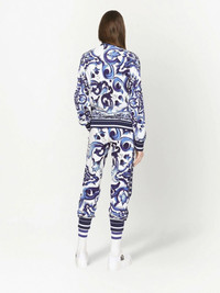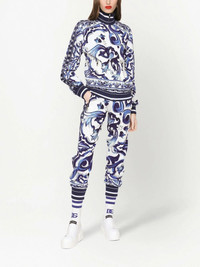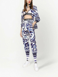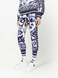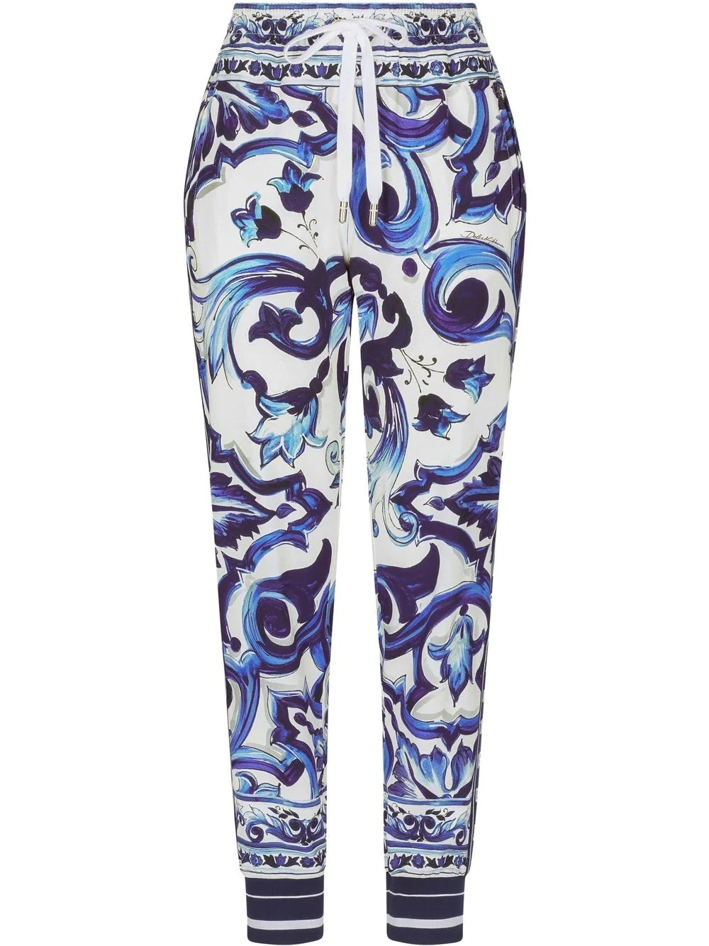 Majolica-print track pants Highlights - Majolica-print cady track trousers from dolce & gabbana featuring navy blue, white, majolica print, high waist, drawstring fastening waist, side slits, tapered leg and elasticated ankles. Made in Italy Composition Rayon 97%, Spandex/Elastane 3%