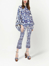 Majolica-print flared trousers Highlights - Navy blue - Stretch-cotton - Majolica print - Mid-rise - Flared design - Cropped leg Made in Italy Composition Silk 94%, Spandex/Elastane 6% SIZE & FIT Measurement INSIDE LEG 26.77 in(68 cm) HIPS 37 in(94 cm) WAIST 31.49 in(80 cm)