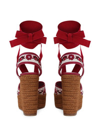 Majolica-print espadrilles Dolce & Gabbana's espadrilles are punctuated with the brand's painterly Majolica print inspired by Sicilian tiles - a nod to the designers' Italian roots. They're set on a towering block heel and balanced with a platform. Highlights - Off-white/dark red - Goatskin - Majolica print - Jute sole - High wedge heel - Tie-fastening ankle strap Imported Composition Leather 100%