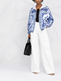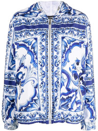 Majolica-print hooded windbreaker Defined by a white and blue Majolica print, this hooded windbreaker shows Dolce & Gabbana's bold Sicilian-inspired style. Its design is crafted with a lightweight construction and features two side zip-fastening pockets. Highlights - White/royal blue - Lightweight construction - Majolica print - Classic hood - Front zip fastening - Long sleeves - Elasticated cuffs - Two side zip-fastening pockets - Straight hem Made in Italy Composition Lining: Polyamide 80%, Polyester 20% Outer: Polyester 100% SIZE & FIT Model measurements Height 5 ft 11 in(1.8 m) Bust/Chest 31.49 in(80 cm) Hips 35.82 in(91 cm) Waist 24.8 in(63 cm) FittingInformation This piece fits true to size. We recommend you get your regular size Cut for a relaxed fit Made with a mid-weight non-stretch fabric Washing instructions Machine Wash