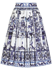 Majolica-print pleated A-line midi skirt
