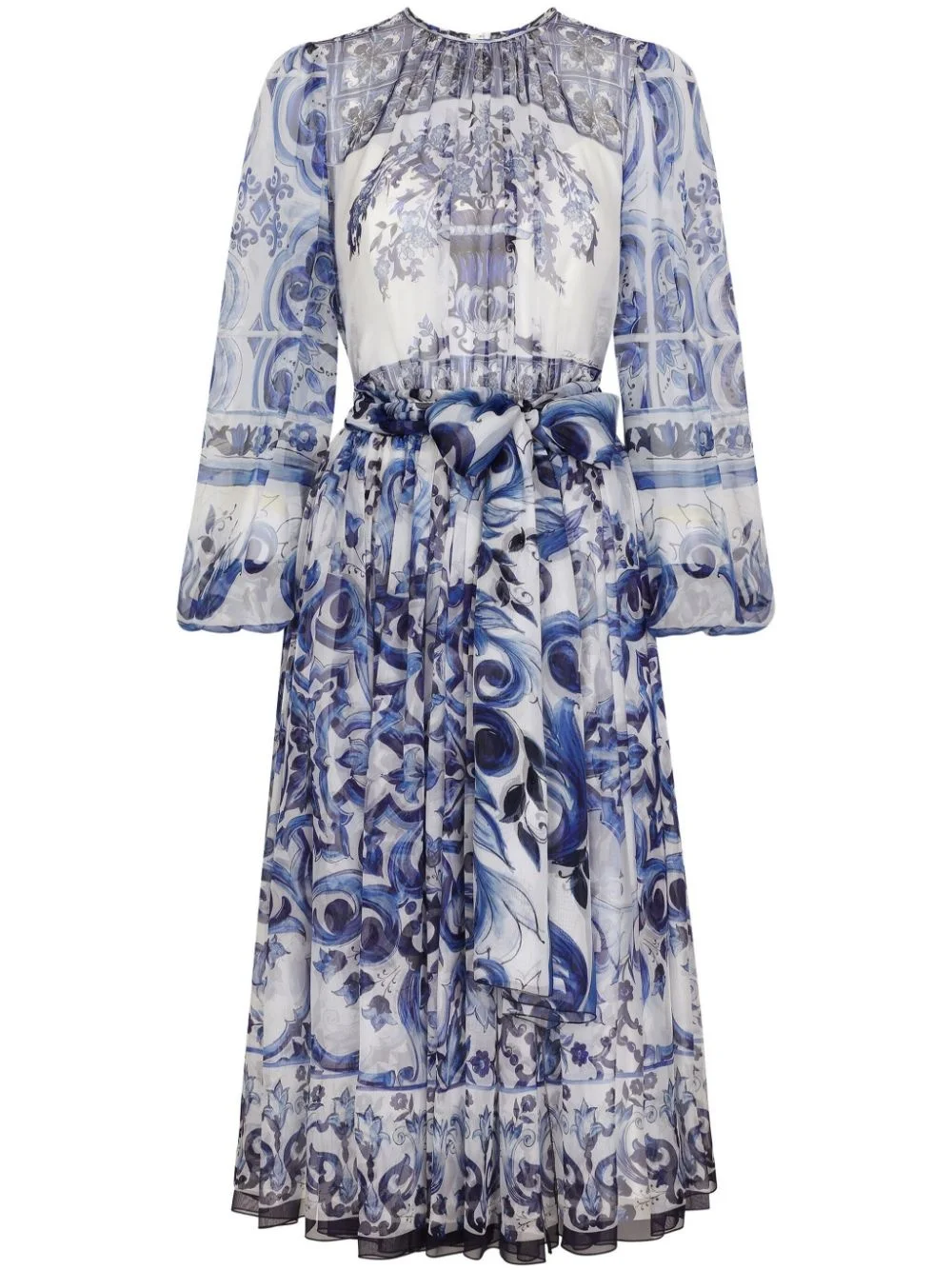 Majolica-print silk midi dress Conjuring up images of a Mediterranean lifestyle, this Dolce & Gabbana midi dress boasts a white silk-chiffon base saturated with a majolica print incorporating naturalistic, calligraphy-style motifs in a deep shade of blue. It's cut to a flared silhouette fitted with a waist belt. Highlights - Royal blue/white - Silk - Chiffon - Majolica print - Gathered detailing - Round neck - Concealed rear hook and zip fastening - Long sleeves - Balloon sleeves - Elasticated cuffs - Belted waist - Flared skirt - Internal slip dress - Flared hem - Mid-length Made in Italy Composition Silk 100% SIZE & FIT Measurement LENGTH 46.06 in(117 cm) WAIST 25.19 in(64 cm) HIPS 38.58 in(98 cm)