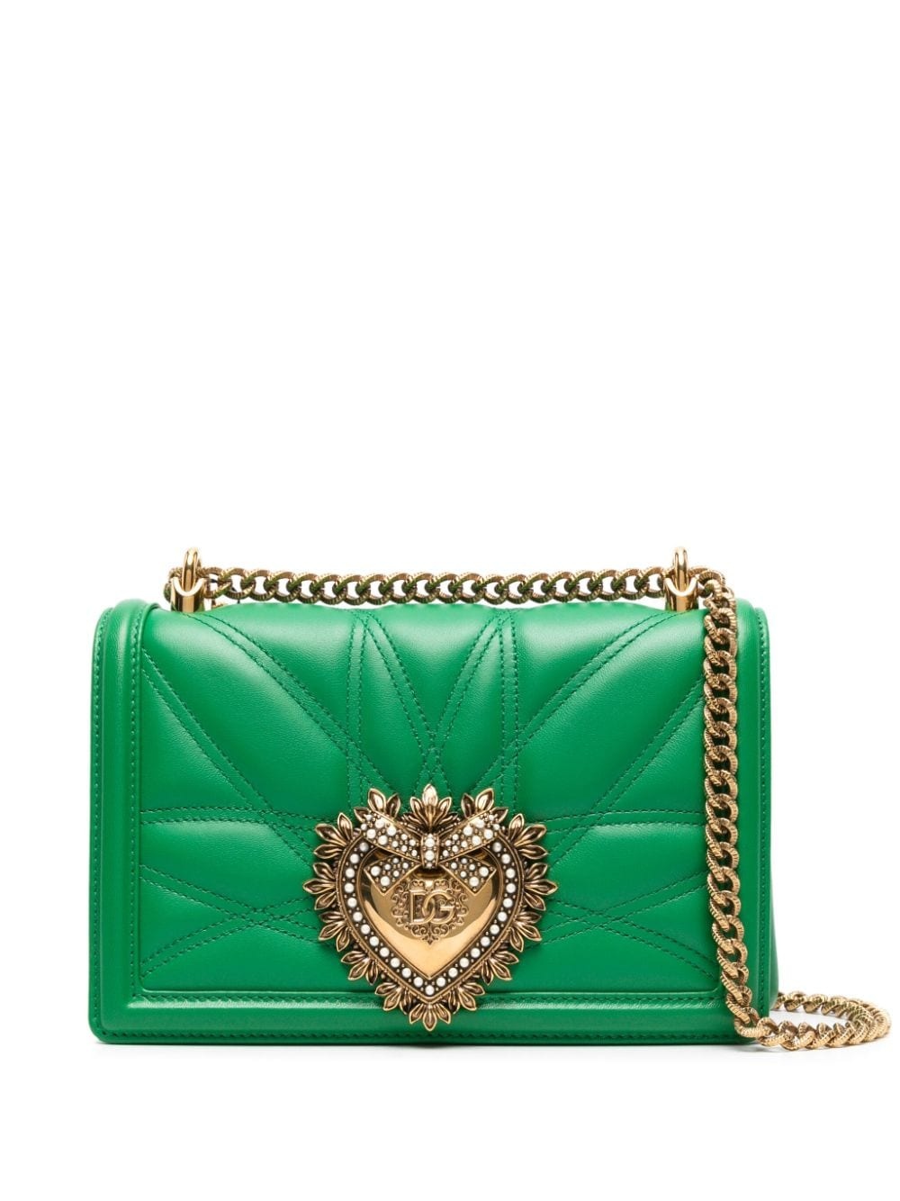 medium Devotion quilted shoulder bag Highlights - Bright green - Calf leather - Quilted - Chain-link shoulder strap - Heart motif - Faux-pearl embellishment - Foldover top with magnetic fastening - Main compartment - Internal zip-fastening pocket - Internal logo plaque - Gold-tone hardware Made in Italy Composition Outer: Calf Leather 100% SIZE & FIT Model measurements Height 5 ft 10 in(1.77 m) Bust/Chest 33.07 in(84 cm) Hips 37 in(94 cm) Waist 24.8 in(63 cm) Measurement DEPTH 3.14 in(8 cm) HEIGHT 5.9 in(15 cm) WIDTH 7.87 in(20 cm)