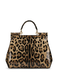 KIM DOLCE&GABBANA large Sicily top-handle bag One of the label’s signature styles, Dolce & Gabbana’s Sicily bag pays homage to the Italian design duo’s roots. Retaining the structured leather silhouette, this iteration is saturated with leopard spots. Highlights - Black/brown - Calf leather - Polished finish - Leopard print - Pale gold-tone hardware - Gold-tone logo plaque - Foldover top with magnetic fastening - Single top handle - Adjustable detachable shoulder strap - Main compartment - Internal slip pocket - Metal feet - This piece comes complete with a protective dust bag. Made in Italy Composition Outer: Leather 100% Lining: Leather 95%, Viscose 5% SIZE & FIT Measurement DEPTH 4.72 in(12 cm) HEIGHT 8.26 in(21 cm) WIDTH 10.23 in(26 cm)