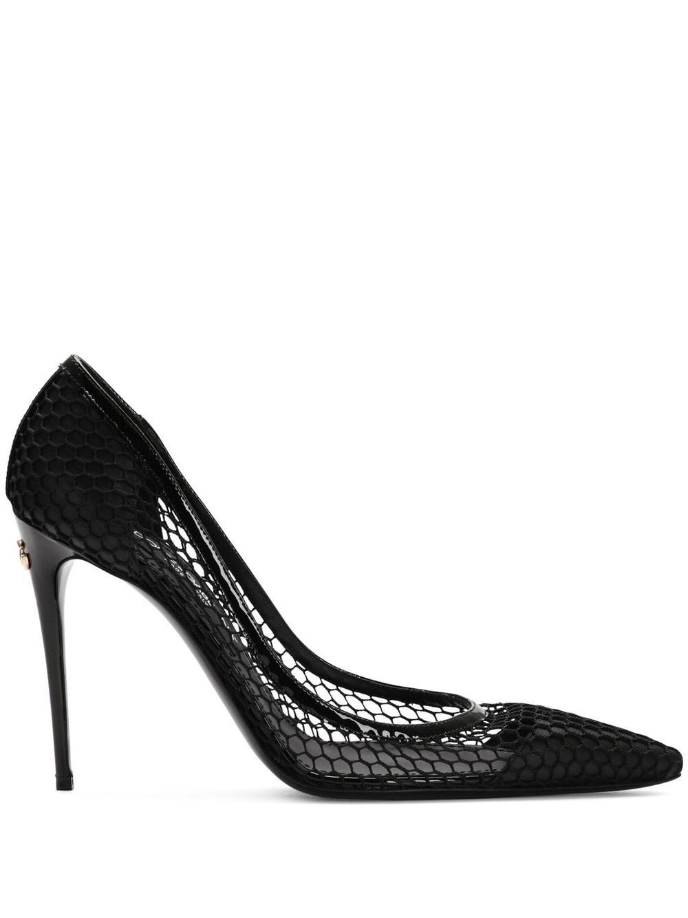105mm patent leather mesh pumps Highlights - Jet black - Leather trim - Mesh detailing - Gold-tone logo lettering - Branded insole - Pointed toe - High stiletto heel - Slip-on style Made in Italy Composition Outer: Nylon 82%, CALFSKIN 18% Lining: Nylon 45%, Goat Skin 35%, CALFSKIN 20% Sole: Leather 100%