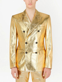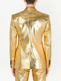 metallic double-breasted blazer gold metallic finish peak lapels chest welt pocket long sleeves buttoned cuffs double-breasted button fastening two front flap pockets central rear vent Made in Italy Composition Nylon 86%, Spandex/Elastane 14%
