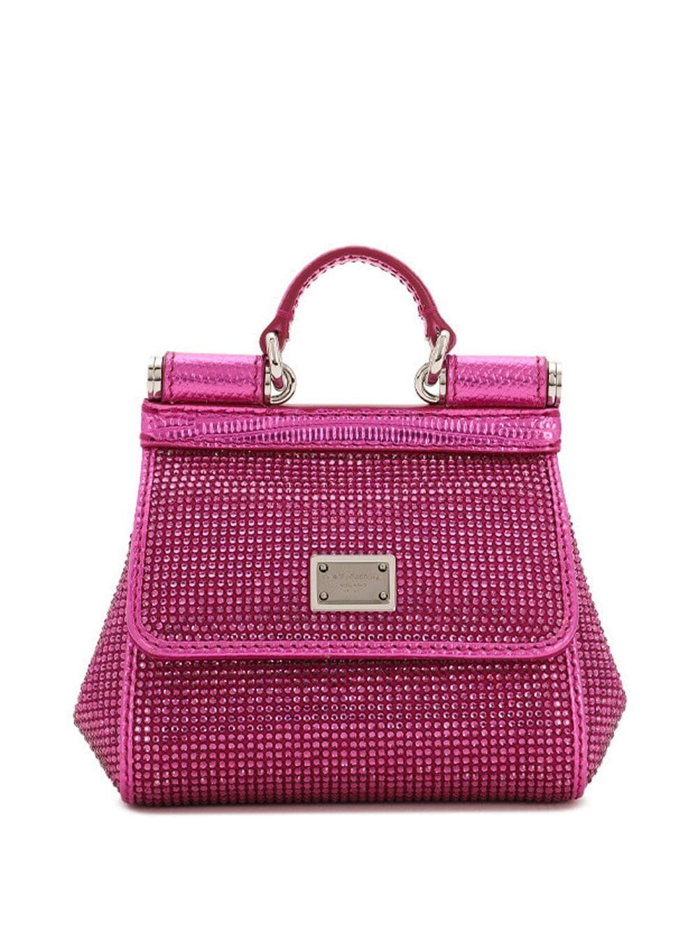 mini Sicily rhinestone-embellished tote bag Highlights - Fuchsia pink - Calf leather-silk blend - Foiled finish - Iguana-print - Silver-tone logo plaque - Rhinestone embellishment - Foldover top with magnetic fastening - Detachable chain-link shoulder strap - Single top handle - Satin lining - This piece comes complete with a protective dust bag. Made in Italy Composition Lining: Rayon 58%, Silk 22%, Calf Leather 10%, Nylon 7%, Polyurethane 3% Outer: Rhinestone 100%, Rayon 58%, Silk 27%, Calf Leather 15%