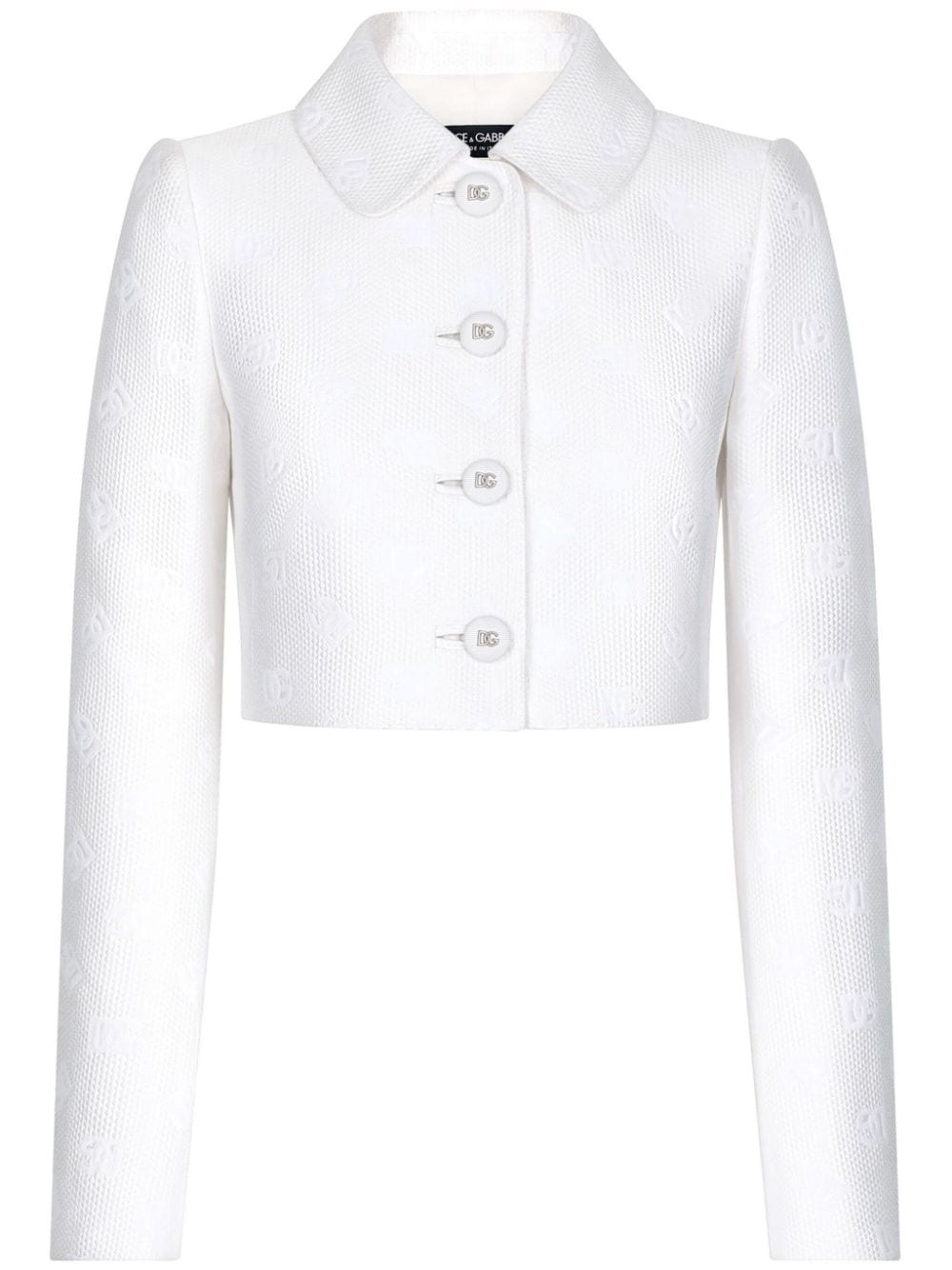 monogram-jacquard button-down cropped jacket Highlights - White - Monogram jacquard - Cropped - Logo-embossed buttons - Classic collar - Front button fastening - Long sleeves - Straight hem Made in Italy Composition Cotton 43%, Polyester 34%, Silk 23% Washing instructions Read Manufacturer Guidelines