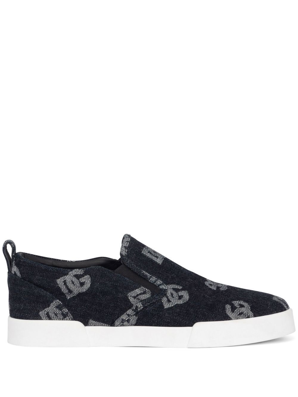 monogram jacquard slip-on sneakers Highlights - Navy blue/white - Leather - Cotton blend - Monogram jacquard - Pull-tab at the heel - Slip-on style - Round toe - Flat rubber sole Made in Italy Composition Lining: Lamb Skin 100% Sole: Rubber 100% Outer: Cotton 93%, Polyester 4%, Spandex/Elastane 2%, Elastodiene 1%